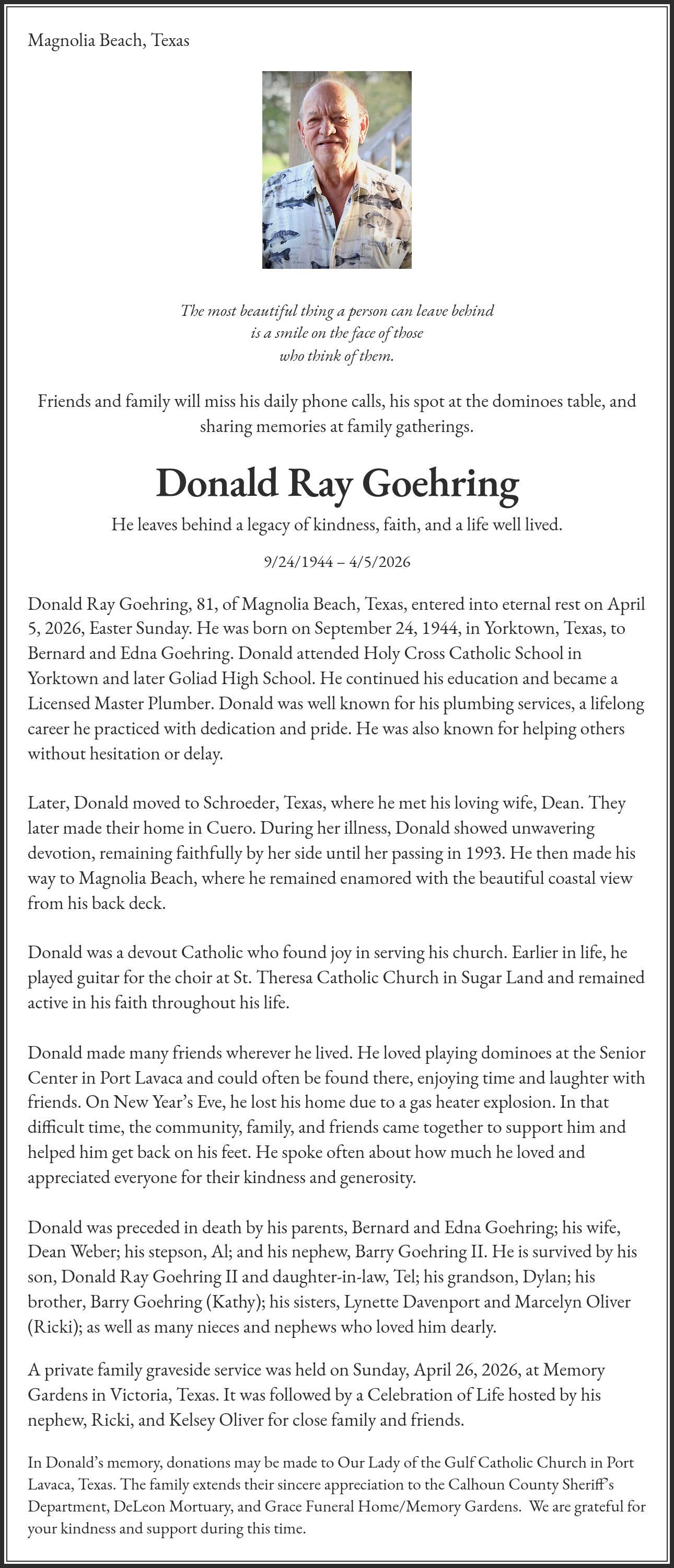 Donald Ray Goehring, 81, of Magnolia Beach, Texas, entered into eternal rest on April 5, 2026, Easter Sunday. He was born on September 24, 1944, in Yorktown, Texas, to Bernard and Edna Goehring. Donald attended Holy Cross Catholic School in Yorktown and later Goliad High School. He continued his education and became a Licensed Master Plumber. Donald was well known for his plumbing services, a lifelong career he practiced with dedication and pride. He was also known for helping others without hesitation or delay. Later, Donald moved to Schroeder, Texas, where he met his loving wife, Dean. They later made their home in Cuero. During her illness, Donald showed unwavering devotion, remaining faithfully by her side until her passing in 1993. He then made his way to Magnolia Beach, where he remained enamored with the beautiful coastal view from his back deck. Donald was a devout Catholic who found joy in serving his church. Earlier in life, he played guitar for the choir at St. Theresa Catholic Church in Sugar Land and remained active in his faith throughout his life. Donald made many friends wherever he lived. He loved playing dominoes at the Senior Center in Port Lavaca and could often be found there, enjoying time and laughter with friends. On New Year’s Eve, he lost his home due to a gas heater explosion. In that difficult time, the community, family, and friends came together to support him and helped him get back on his feet. He spoke often about how much he loved and appreciated everyone for their kindness and generosity. Donald was preceded in death by his parents, Bernard and Edna Goehring; his wife, Dean Weber; his stepson, Al; and his nephew, Barry Goehring II. He is survived by his son, Donald Ray Goehring II and daughter-in-law, Tel; his grandson, Dylan; his brother, Barry Goehring (Kathy); his sisters, Lynette Davenport and Marcelyn Oliver (Ricki); as well as many nieces and nephews who loved him dearly.