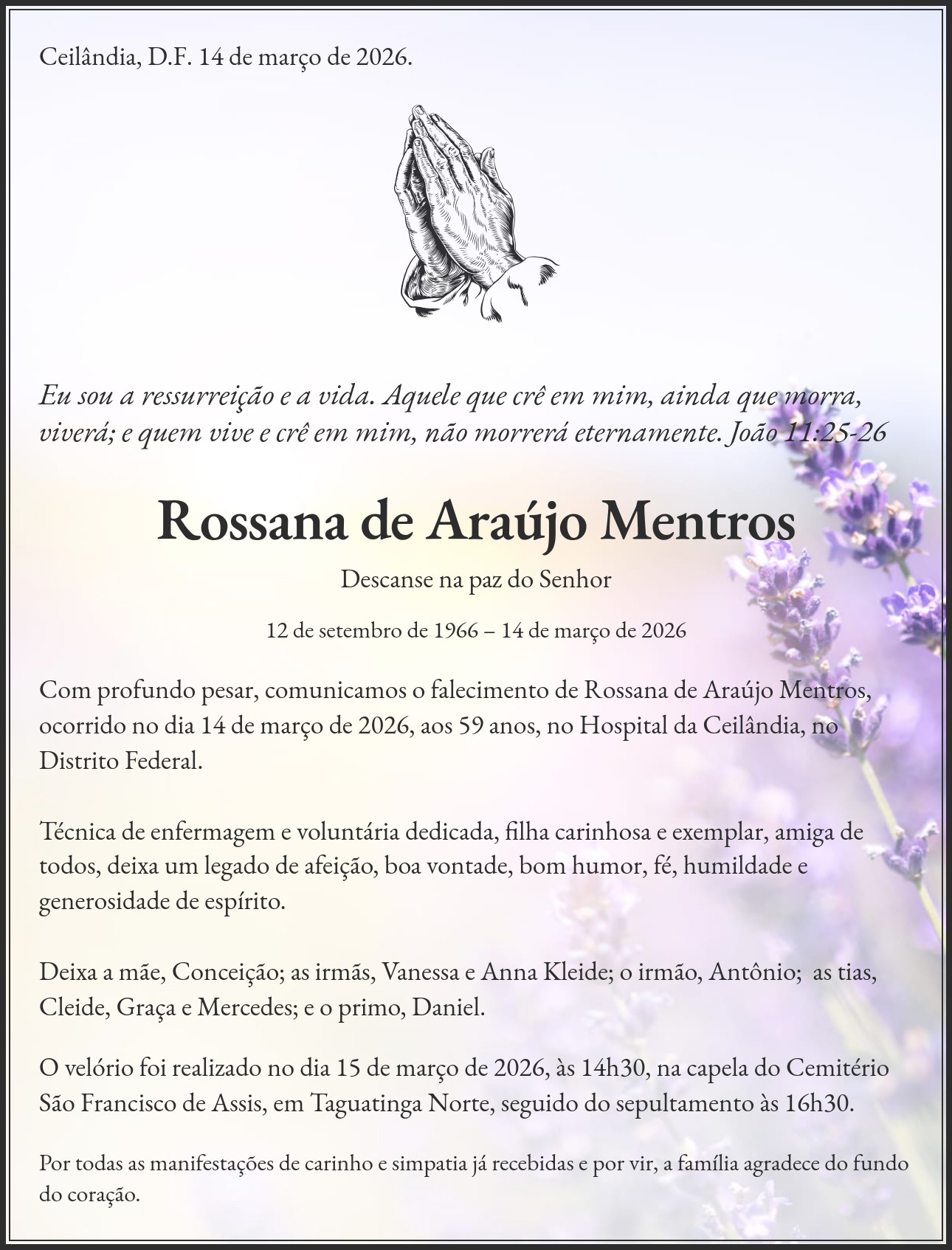 Com profundo pesar, comunicamos o falecimento de Rossana de Araújo Mentros, ocorrido no dia 14 de março de 2026, aos 59 anos, no Hospital da Ceilândia, no Distrito Federal. Técnica de enfermagem e voluntária dedicada, filha carinhosa e exemplar, amiga de todos, deixa um legado de afeição, boa vontade, bom humor, fé, humildade e generosidade de espírito. Deixa a mãe, Conceição; as irmãs, Vanessa e Anna Kleide; o irmão, Antônio; as tias, Cleide, Graça e Mercedes; e o primo, Daniel.