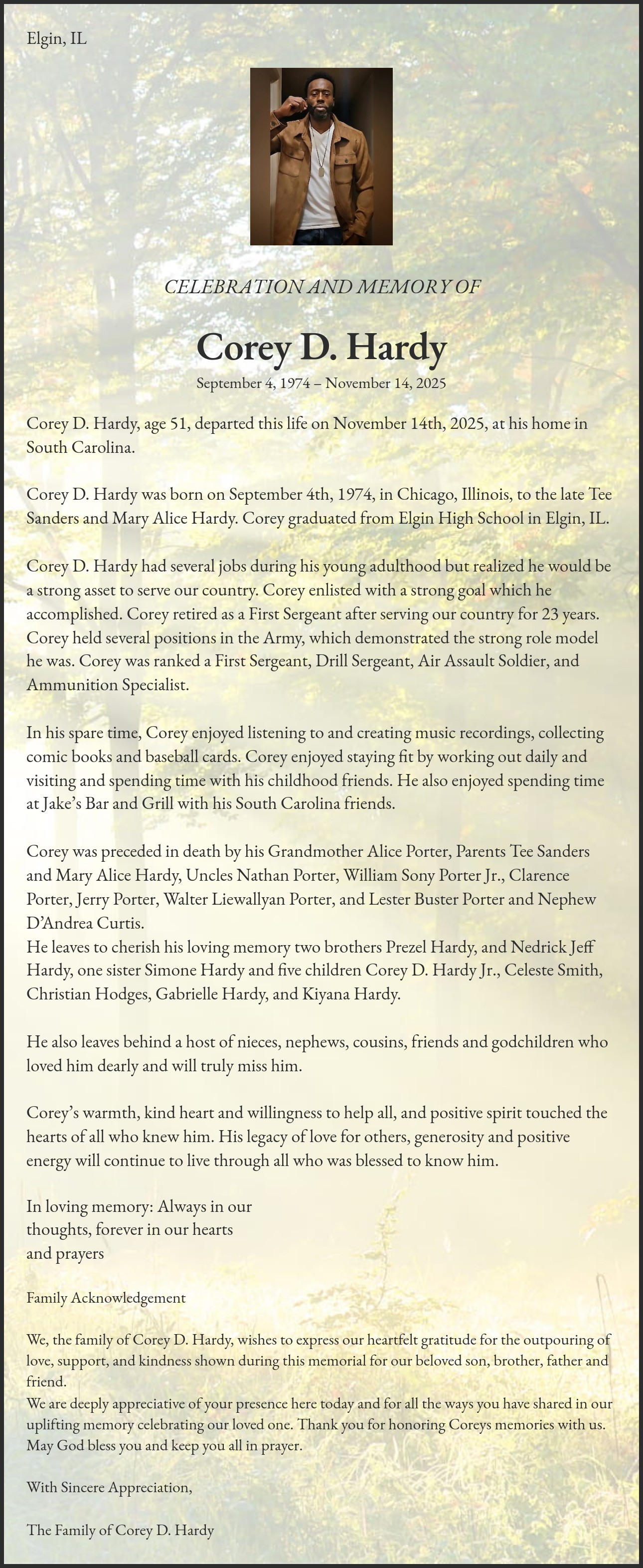 Corey D. Hardy, age 51, departed this life on November 14th, 2025, at his home in South Carolina. Corey D. Hardy was born on September 4th, 1974, in Chicago, Illinois, to the late Tee Sanders and Mary Alice Hardy. Corey graduated from Elgin High School in Elgin, IL. Corey D. Hardy had several jobs during his young adulthood but realized he would be a strong asset to serve our country. Corey enlisted with a strong goal which he accomplished. Corey retired as a First Sergeant after serving our country for 23 years. Corey held several positions in the Army, which demonstrated the strong role model he was. Corey was ranked a First Sergeant, Drill Sergeant, Air Assault Soldier, and Ammunition Specialist. In his spare time, Corey enjoyed listening to and creating music recordings, collecting comic books and baseball cards. Corey enjoyed staying fit by working out daily and visiting and spending time with his childhood friends. He also enjoyed spending time at Jake’s Bar and Grill with his South Carolina friends. Corey was preceded in death by his Grandmother Alice Porter, Parents Tee Sanders and Mary Alice Hardy, Uncles Nathan Porter, William Sony Porter Jr., Clarence Porter, Jerry Porter, Walter Liewallyan Porter, and Lester Buster Porter and Nephew D’Andrea Curtis. He leaves to cherish his loving memory two brothers Prezel Hardy, and Nedrick Jeff Hardy, one sister Simone Hardy and five children Corey D. Hardy Jr., Celeste Smith, Christian Hodges, Gabrielle Hardy, and Kiyana Hardy. He also leaves behind a host of nieces, nephews, cousins, friends and godchildren who loved him dearly and will truly miss him. Corey’s warmth, kind heart and willingness to help all, and positive spirit touched the hearts of all who knew him. His legacy of love for others, generosity and positive energy will continue to live through all who was blessed to know him.